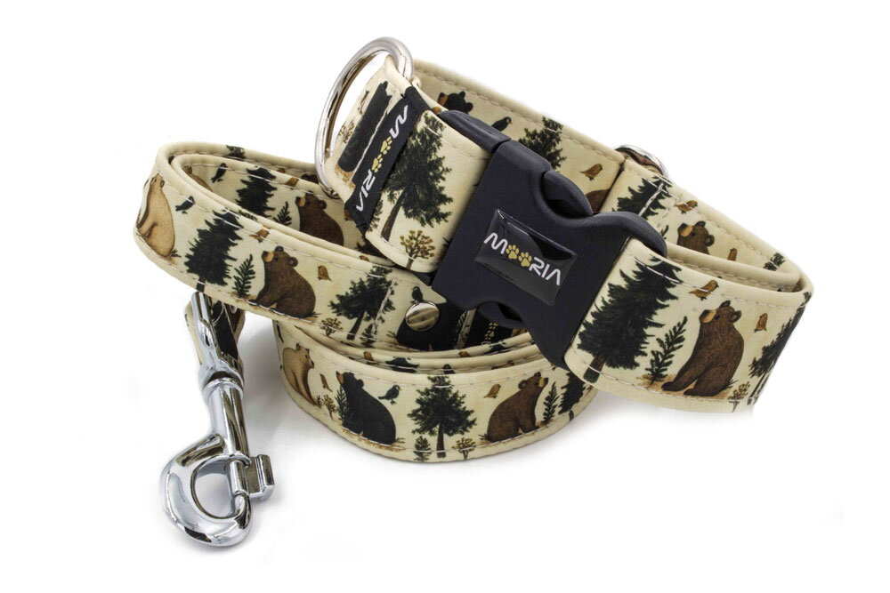 Vodítko pro psy Bear Friends s medvědy v lese na béžovém pozadí. Vyberte typ a šířku vodítka (4 velikosti) s volitelným prodloužením.